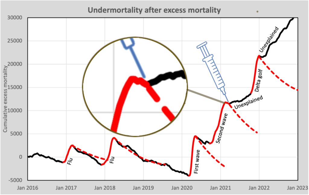 Zodra iets de zegeningen van de vaccins in twijfel kon trekken werd het met de grond gelijk gemaakt. Dat is geen overtuiging of wetenschap meer. Dat past beter bij gedrag dat voorkomt uit de angst om betrapt te worden. Maar betrapt waarop? Dat weten we niet precies: in elk geval een fout besluit of beter: een keten van foute besluiten. In het begin omdat men best wel besefte een enorme gok te hebben genomen (voor de Goede Zaak) op basis van niet meer dan aangeprate paniek. Het was niet in het landsbelang om dat te erkennen, dat zou maar onrust veroorzaken. Dus dat werd double-downen.