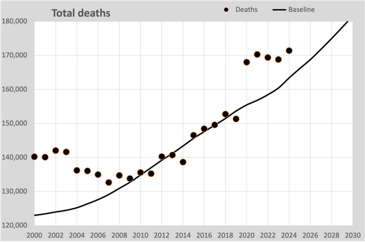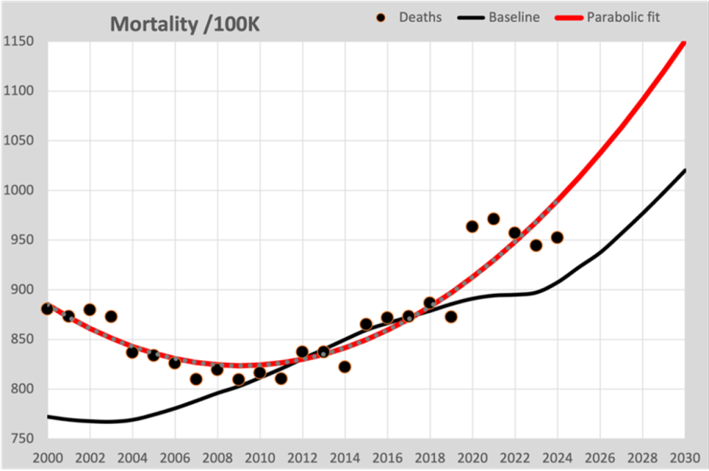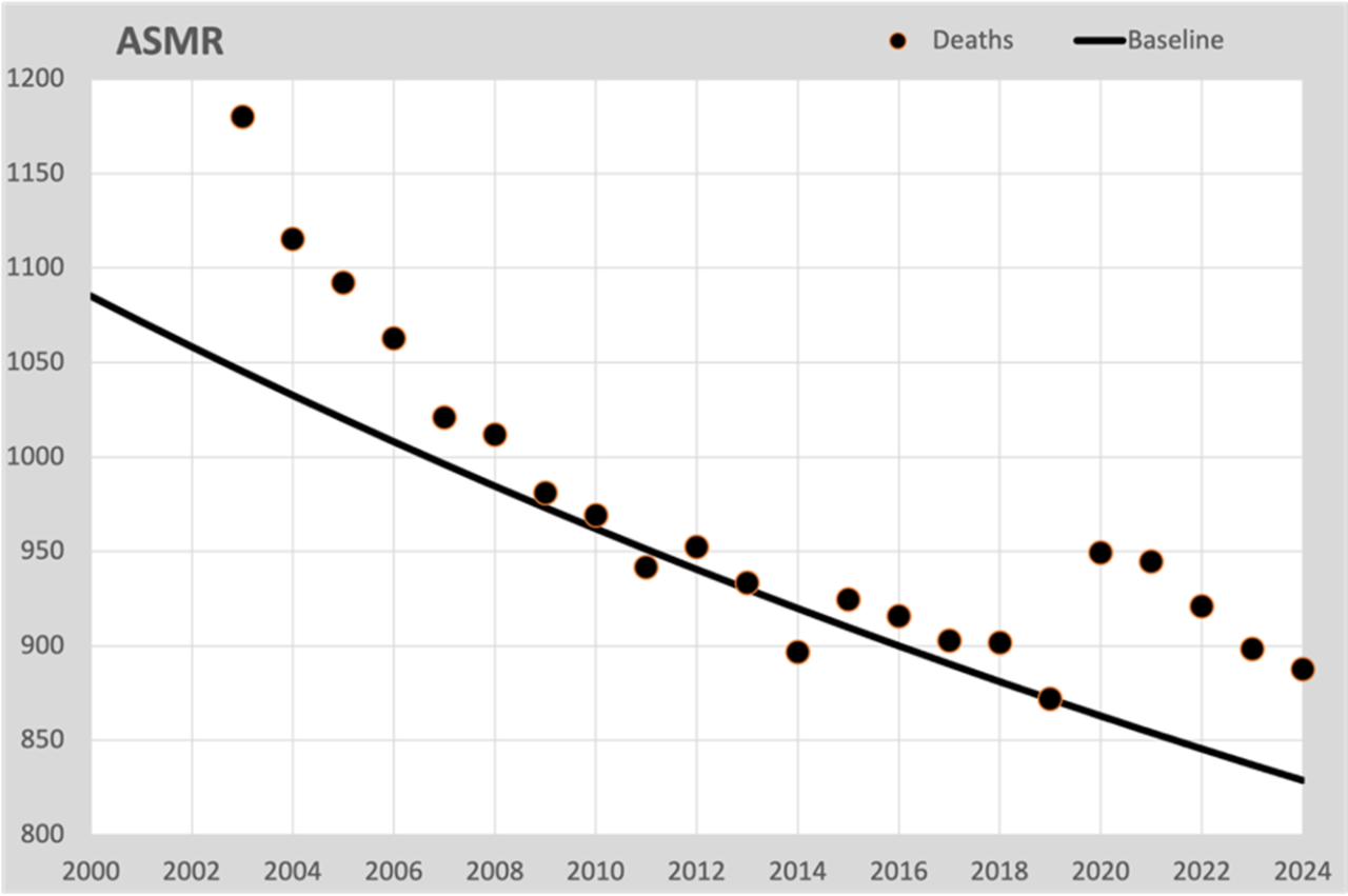 Dit is als het ware de sterftekans als de bevolkingssamenstelling niet zou zijn veranderd, geen vergrijzing. Alhoewel we deze cijfers niet rechtstreeks kunnen vergelijken met de daadwerkelijke sterfte, geeft het wel een goed inzicht in de ontwikkeling van de sterfteverwachting. Net als bij de sterfteverwachting voor 50 jaar in de eerste grafiek ook hier dezelfde daling, berekend voor alle inwoners volgens de ASMR-methode. En het belangrijkste: hier zien we de oversterfte ontstaan vanaf 2020. Ontdaan van alle vergrijzingseffecten. Dus iedereen die vergrijzing noemt als oorzaak van de oversterfte, kan aan deze grafiek zien dat het niets met vergrijzing te maken heeft.