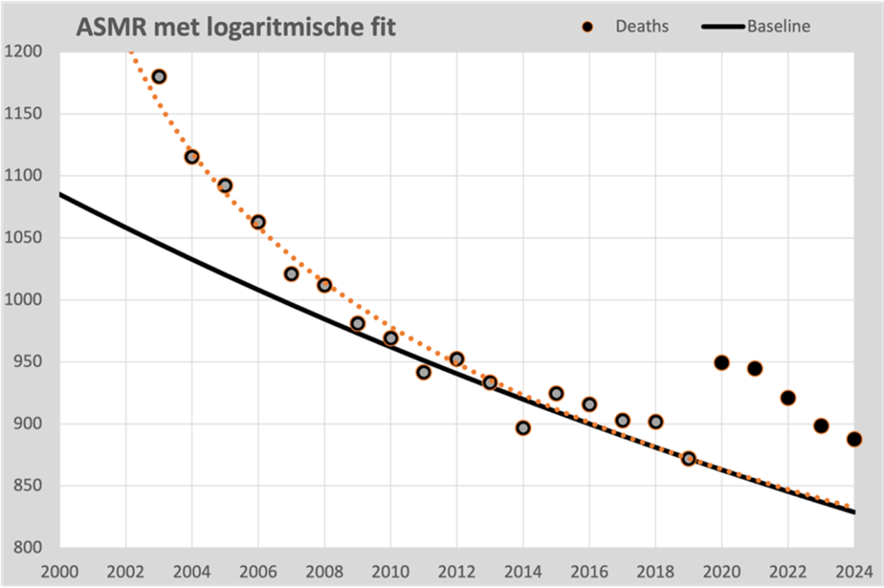 De ultieme manier om veranderingen in de bevolkingssamenstelling te compenseren is de ASMR (Age Standardized Mortality Rate). Daarbij worden de sterftecijfers omgerekend naar een standaard bevolking. In ons geval kiezen we voor de bevolkingsopbouw van 2019, de laatste zonder invloed van de “grote onbekendeâ€. Ook de baseline rekenen we op deze manier om naar de cijfers van 2019. Dit is de grafiek die daarbij hoort: