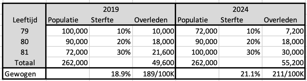 In 2024 verwisselen we de populaties voor 79 en 81 jaar. We zien nu dus meer overlijdens dan in 2019, terwijl het totaal aantal inwoners en de sterftekansen hetzelfde blijven. De gemiddelde sterftekans van het cohort is nu juist hoger geworden. Dus de uitkomst van die sterftekans hangt af van de verdeling van de populaties binnen het cohort.