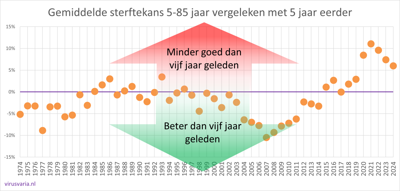 Maar hoeveel zegt dat dan weer? Is dat niet veel vaker voorgekomen, in de afgelopen 50 jaar bijvoorbeeld? We vergelijken elk jaar eens met vijf jaar daarvoor. Meer sterfte dan 5 jaar geleden staat boven de 0%-lijn.