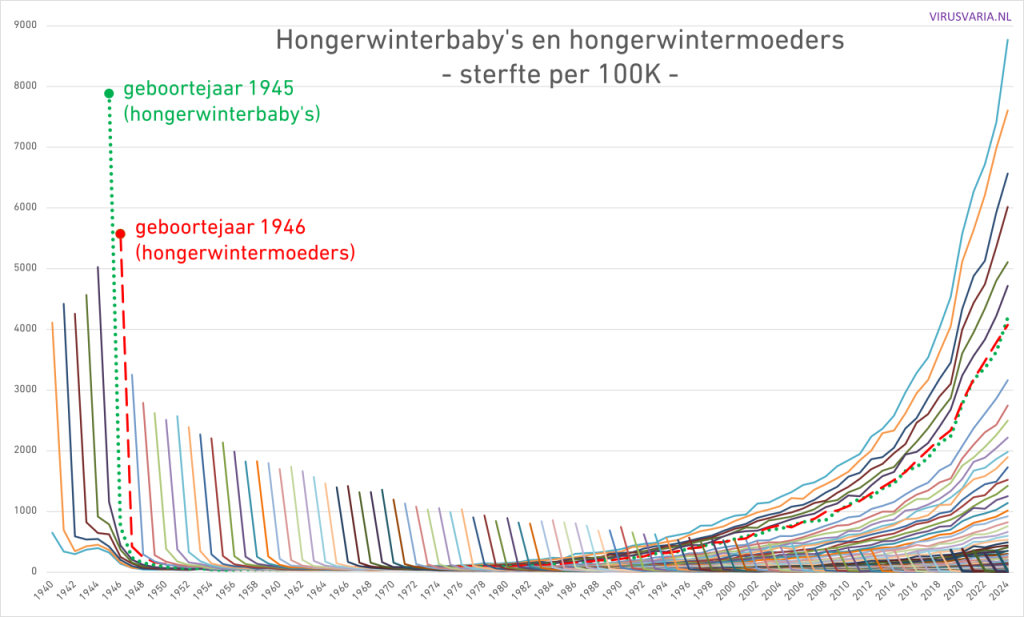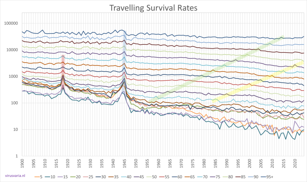Travelling Survival Rates – ik vond het een mooie term. Die sterftepiek reist door de tijd heen met het cohort mee. Er bestaat ook literatuur over maar zo uitgesproken als in deze grafiek ben ik het niet tegengekomen.